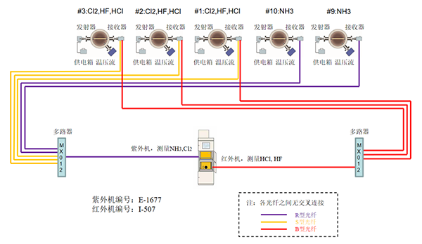 解決方案概述:博測環(huán)境提供的整體解決方案是采用非接觸式差分吸收光譜法(DOAS),使用一條光路貫穿整個管道。光束通過光纖傳輸?shù)椒治鰞x,而這個分析儀又同時監(jiān)測幾個路徑。滿足同時監(jiān)測全部排口,多種因子,包括了酸性氣體、堿性氣體和VOCs氣體。該方案采用了先進(jìn)的光譜法(UV/IR)監(jiān)測酸堿氣體和氣相色譜法(GC-FID)監(jiān)測VOCs氣體。如下圖: