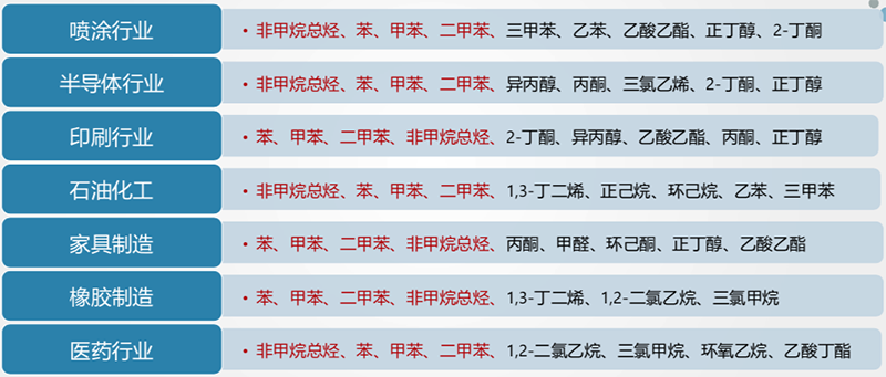 涉及的行業:石油煉制與石油化工行業煤炭加工與轉化行業油類(燃油、溶劑)的儲存、運輸和銷售過程涂料、油墨、膠粘劑、農藥等生產行業涂裝、印刷、粘合、工業清洗等使用行業建筑裝飾裝修、服裝干洗、餐飲油煙等生活源