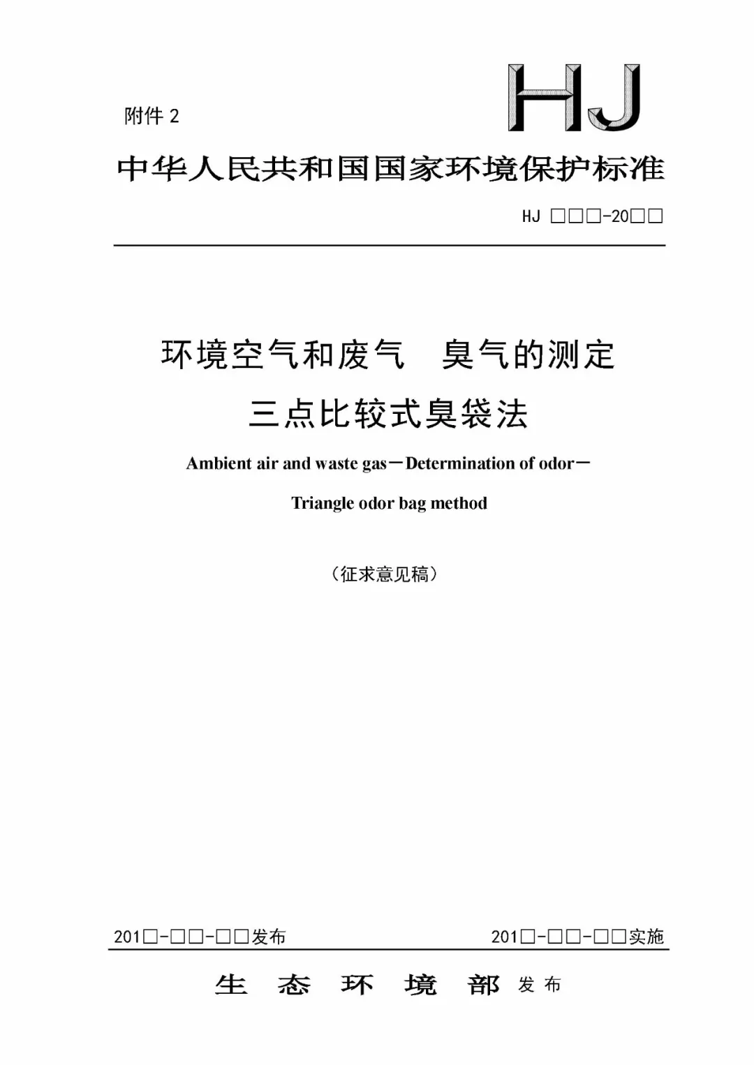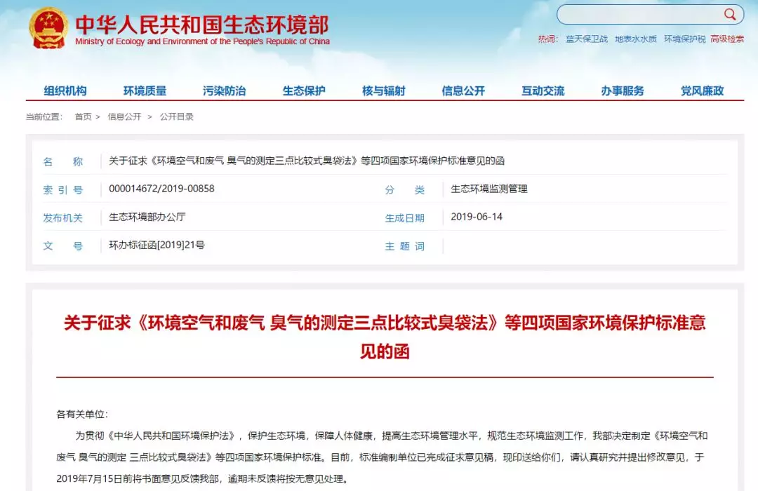 2019年6月14日,生態(tài)環(huán)境部發(fā)布“關(guān)于征求《環(huán)境空氣和廢氣 臭氣的測定三點比較式臭袋法》等四項國家環(huán)境保護標準意見的函”: