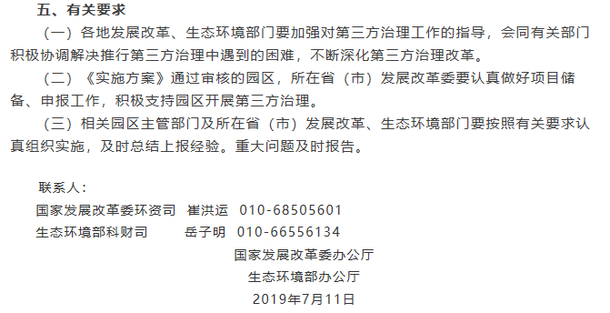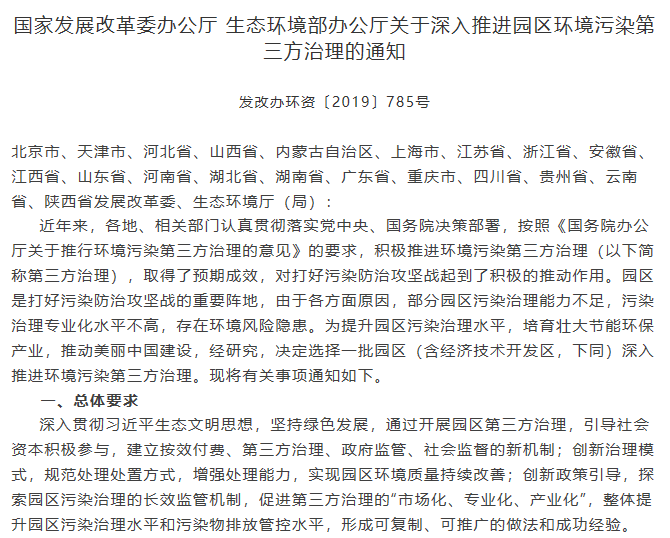 其中,在培育第三方治理新模式方面,《通知》明確提出,園區依法委托第三方開展治理服務,提供包括環境污染問題診斷、系統解決方案,污水和固體廢棄物集中處理處置、煙氣治理、污染物排放監測以及監管信息平臺等環境綜合治理服務。