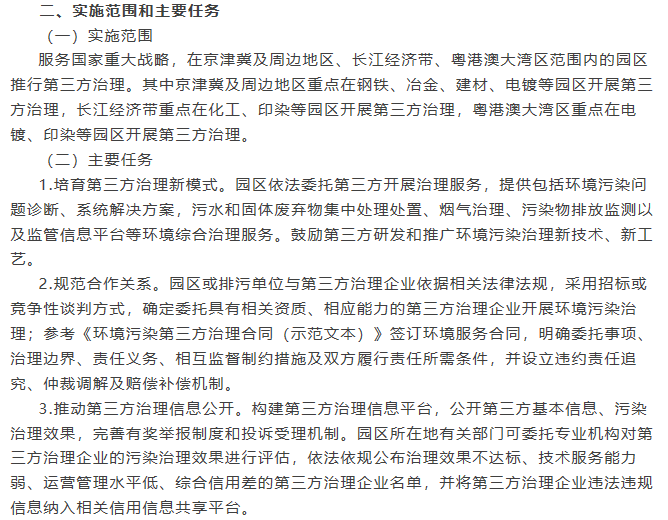 《通知》明確,為服務國家重大戰略,在京津冀及周邊地區、長江經濟帶、粵港澳大灣區范圍內的園區推行第三方治理。其中京津冀及周邊地區重點在鋼鐵、冶金、建材、電鍍等園區開展第三方治理,長江經濟帶重點在化工、印染等園區開展第三方治理,粵港澳大灣區重點在電鍍、印染等園區開展第三方治理。