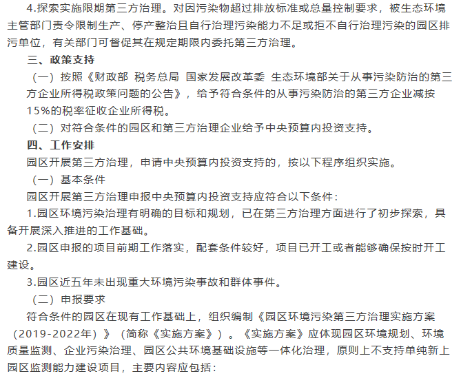 對此,《通知》也在政策支持方面給予明確。即,按照給予符合條件的從事污染防治的第三方企業減按15%的稅率征收企業所得稅,對符合條件的園區和第三方治理企業給予中央預算內投資支持。
