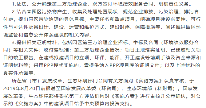 《通知》指出,園區開展第三方治理申報中央預算內投資支持應符合以下條件,即園區環境污染治理有明確的目標和規劃,已在第三方治理方面進行了初步探索,具備開展深入推進的工作基礎;園區申報的項目前期工作落實,配套條件較好,項目已開工或者能夠確保按時開工建設;園區近五年未出現重大環境污染事故和群體事件。