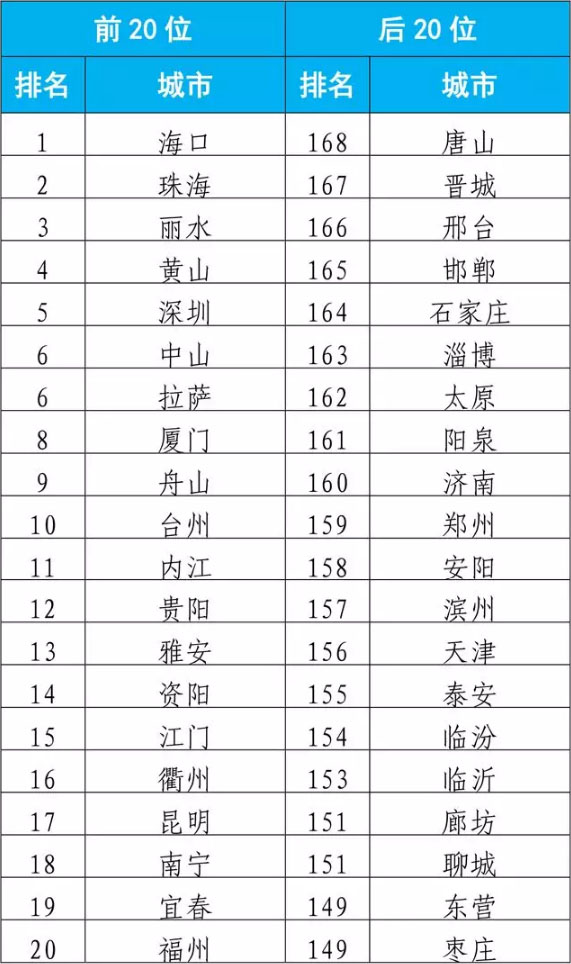 2019年7月,168個(gè)重點(diǎn)城市中唐山、晉城、邢臺(tái)市等20個(gè)城市空氣質(zhì)量相對(duì)較差(從第168名到并列第149名);???、珠海、麗水市等20個(gè)城市空氣質(zhì)量相對(duì)較好(從第1名到第20名,見附表1)。