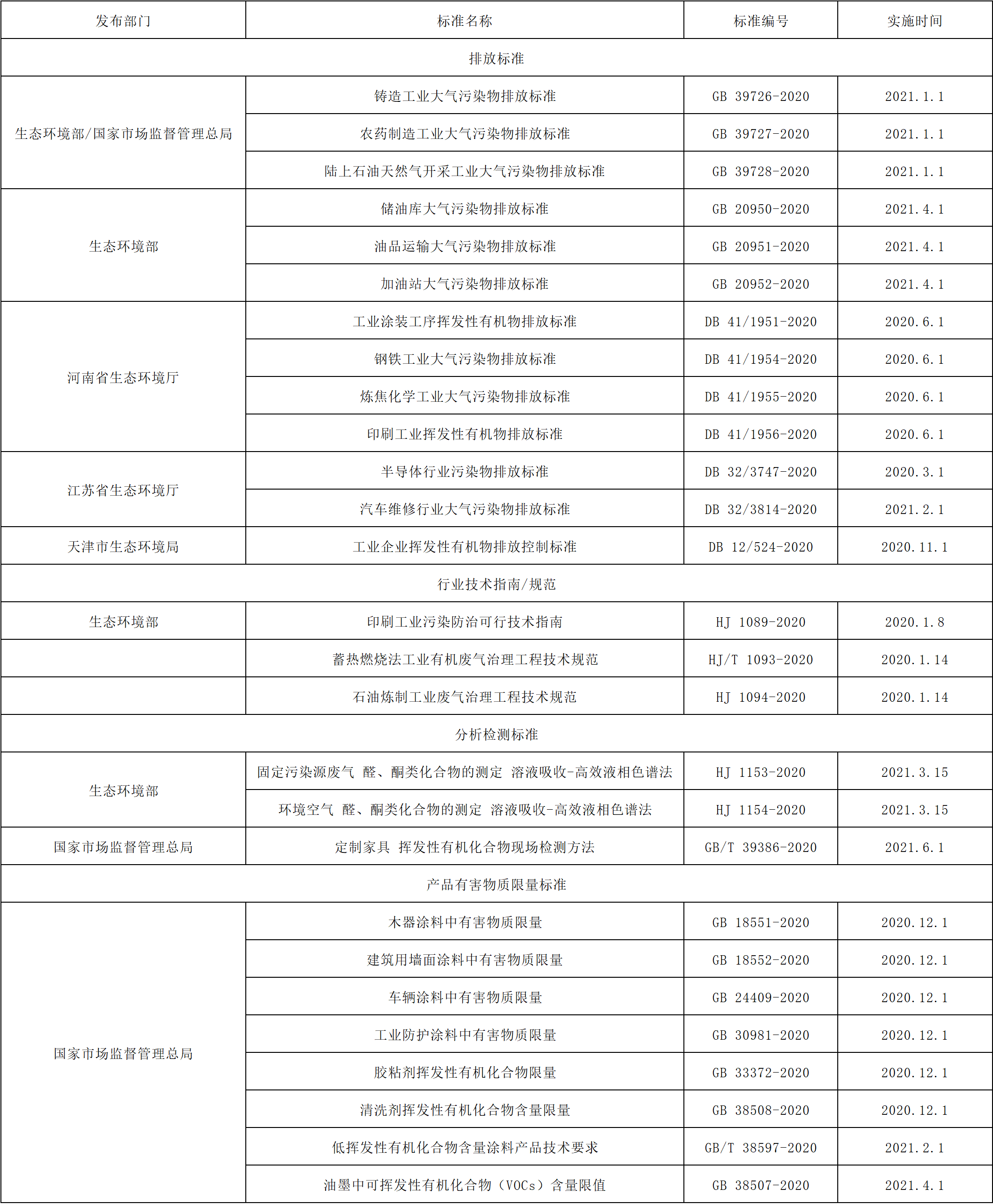 在標準規范方面,國家和地方管理部門、行業協會陸續發布實施相關文件,確保VOCs減排任務的政策落地,具體見表1。